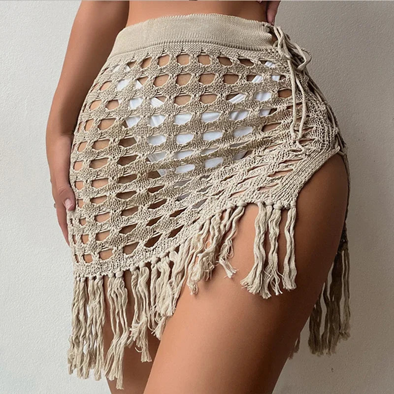 🌴 Saída de Praia Feminina BWQ – Tricô Vazado com Franjas e Fenda Lateral 🌴