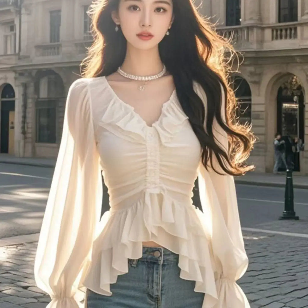 Marca: NoEnName_Null Estilo: Office Lady / Casual elegante Tipo de fechamento: Pulôver (sem botões frontais completos) Decote: Em V Mangas: Longas e bufantes (puff sleeves) Comprimento: Regular Modelagem: Regular Fit Elasticidade: Alta Tecido: Broadcloth leve Composição: Poliéster e Algodão (96% ou mais de fibras sintéticas)